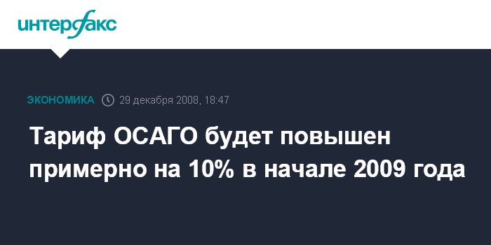 Москва. 29 декабря. INTERFAX.RU - Тариф ОСАГО будет повышен примерно на 10% после корректировки коэффициентов в начале 2009 года, сообщил агентству "ИнтерфаксИ" источник в Минфине РФ. По его словам, проект постановления, корректирующего коэффициенты в ОСАГО, Минфин планирует направить на согласование в заинтересованные ведомства в оставшиеся дни уходящего года.