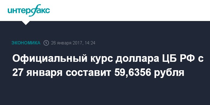 Москва. 26 января. INTERFAX.RU - Официальный курс доллара США по отношению к рублю, объявленный Банком России с 27 января, составляет 59,6356 рубля, сообщает пресс-служба Банка России. Таким образом, стоимость рубля, выраженная в долларах, по сравнению с предыдущим днем снизилась на 0,82%.