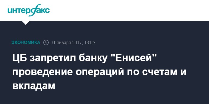 Москва. 31 января. INTERFAX.RU - Центральный банк РФ ввел запрет на проведение операций по счетам и вкладам в банке "Енисей", сообщил "Интерфаксу" представитель банка. Ранее банк опровергал появившуюся в соцсетях информацию о введении запрета со стороны ЦБ.