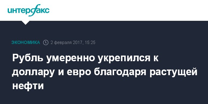 По мнению экспертов "Интерфакс-ЦЭА", укрепление рубля к доллару и евро в первой половине дня 2 февраля связано с продолжающимся ростом мировых цен на нефть, которые в четверг достигли максимума за три недели на новостях о снижении добычи в США и России. Стоимость апрельских фьючерсов на нефть Brent на лондонской бирже ICE Futures к 15:00 МСК поднялась на 0,77% - до $57,24 за баррель. Цена фьючерса на нефть WTI на март на электронных торгах Нью-йоркской товарной биржи (NYMEX) увеличилась к этому времени на 0,54% - до $54,17 за баррель.