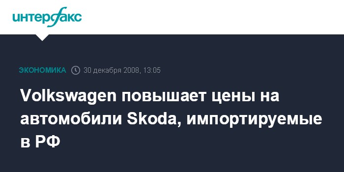 Москва. 30 декабря. INTERFAX.RU - Германский концерн Volkswagen повышает цены на автомобили Skoda, импортируемые в РФ, на 8-11% с 1 января 2009 г., говорится в сообщении компании. Так, Skoda Roomster подорожает на 8%, Skoda Praktik - на 11%, Skoda Superb - также на 8%. Данное повышение стоимости импортируемых в РФ автомобилей компания объясняет повышением таможенных пошлин на ввоз новых импортных иномарок.