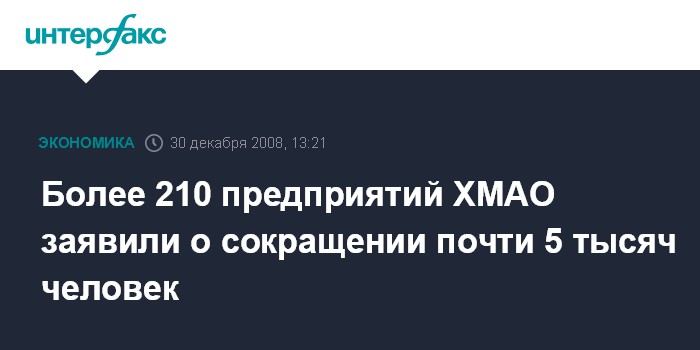 На сегодняшний день в ХМАО под критерии массового сокращения попадают 31 организация со средней численностью 12,336 человек, которые запланировали уменьшение штатов на конец декабря 2008 г. и первый квартал 2009 г. (более 2,7 тысячи человек или 22% от общей численности работников этих предприятий).
