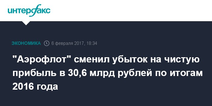 Москва. 6 февраля. INTERFAX.RU - "Аэрофлот" получил в 2016 году 30,617 млрд рублей чистой прибыли по РСБУ против убытка в 18,9 млрд рублей по итогам 2015 года, сообщила компания в понедельник. Выручка за год выросла на 16,8%, до 427,9 млрд руб. В компании это объясняют расширением сети маршрутов и ростом пассажиропотока за прошлый год на 11%, до 29 млн человек.