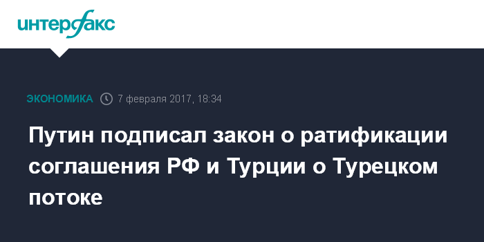 Москва. 7 февраля. INTERFAX.RU - Президент России Владимир Путин подписал федеральный закон о ратификации соглашения между Россией и Турцией о строительстве газопровода "Турецкий поток".