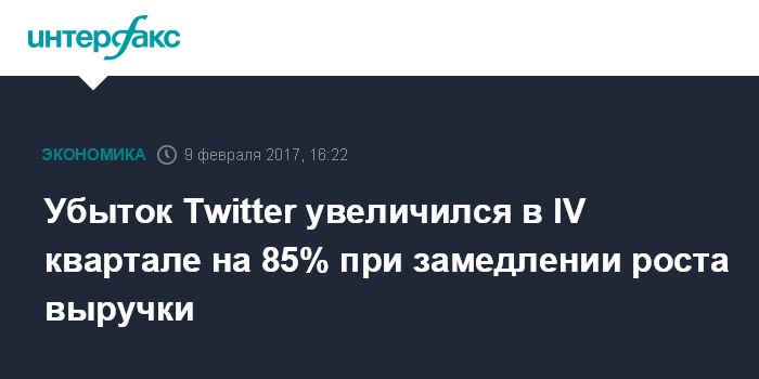 Москва. 9 февраля. INTERFAX.RU - Американская компания Twitter, которой принадлежит одноименная сеть микроблогов, в четвертом квартале 2016 года увеличила чистый убыток на 85%, рост выручки замедлился до 1% и был слабее ожиданий рынка, а месячная аудитория практически не изменилась. Цена акций Twitter рухнула на 11,6% на предварительных торгах в Нью-Йорке в четверг.