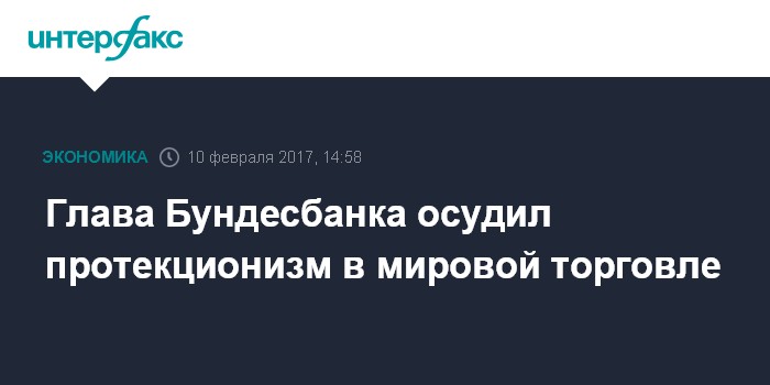 Москва. 10 февраля. INTERFAX.RU - Председатель Бундесбанка и член совета управляющих Европейского центрального банка Йенс Вайдман в пятницу подчеркнул важность торговли и открытых рынков для мировой экономики и выразил сожаление в связи с тем, что лишь их отрицательные аспекты привлекают повышенное внимание. Как пишет MarketWatch, всю неделю представители центральных банков Европы реагировали на протекционистские заявления новой администрации США.