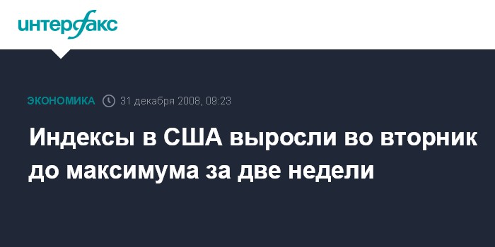Москва. 31 декабря. INTERFAX.RU - Фондовые индексы в США во вторник выросли более чем на 2%, что является максимальным повышением за последние две недели, сообщило агентство Bloomberg.