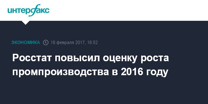 Москва. 18 февраля. INTERFAX.RU - Промышленное производство в РФ в январе 2017 года выросло на 2,3% по сравнению с январем 2016 года, сообщил в субботу Росстат. При этом Росстат полностью пересмотрел помесячную динамику за прошлый год и уточнил оценку в целом за год - теперь рост промпроизводства в 2016 году оценивается в 1,3% вместо 1,1% по предыдущей оценке.