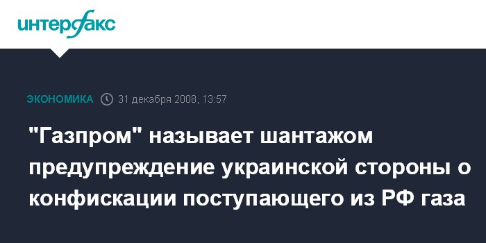 Москва. 31 декабря. INTERFAX.RU - Официальный представитель "Газпрома" Сергей Куприянов назвал позицию "Нафтогаза Украины", пригрозившего конфискацией с 1 января поступающего из России газа и отказе от гарантий его поставок в Европу, грубейшим нарушением ранее достигнутых договоренностей и шантажом.