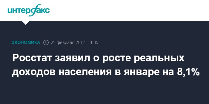 Москва. 22 февраля. INTERFAX.RU - Реальные располагаемые денежные доходы населения РФ в январе 2017 года выросли на 8,1% по сравнению с январем 2016 года, сообщила в среду Федеральная служба государственной статистики. Реальные располагаемые доходы - это доходы населения за вычетом обязательных платежей - прежде всего налогов, и при этом пересчитанные с учетом инфляции.