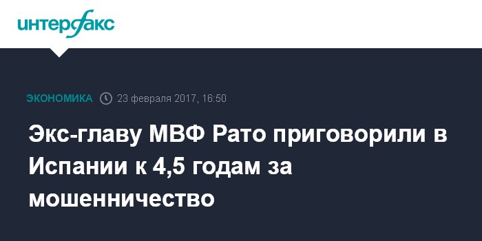 Москва. 23 февраля. INTERFAX.RU - Суд в Испании приговорил к 4,5 годам тюрьмы бывшего директора-распорядителя МВФ Родриго Рато, сообщают европейвские СМИ.