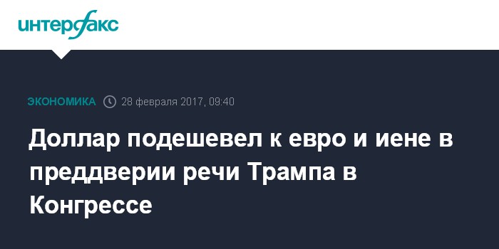 Москва. 28 февраля. INTERFAX.RU - Доллар США слабо дешевеет относительно евро и иены во вторник, несмотря на рост ожиданий повышения базовой процентной ставки Федрезервом после выступления главы Федерального резервного банка (ФРБ) Далласа Роберта Каплана. Внимание трейдеров во вторник направлено на выступление президента США Дональда Трампа в Конгрессе. Участники рынка рассчитывают на то, что он обнародует подробности запланированной налоговой реформы, реформы здравоохранения, расходов на инфраструктуру.
