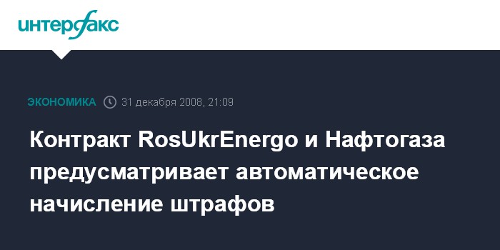 Москва. 31 декабря. ИНТЕРФАКС-АГИ - Контракт RosUkrEnergo и НАК "Нафтогаз Украины" предусматривает автоматическое начисление штрафных санкций, сообщил в среду Агентству газовой информации (АГИ) официальный представитель RosUkrEnergo Андрей Кнутов.