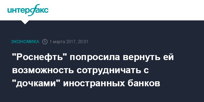 В середине февраля глава "Роснефти" (MOEX: ROSN) Игорь Сечин написал президенту Владимиру Путину письмо, в котором обратил внимание на возникшую в связи с этим проблему, сообщил "Интерфаксу" источник, знакомый с документом. Часть банков - партнеров "Роснефти" с ноября 2016 года была исключена из перечня разрешенных для работы кредитных организаций. В их число попали российские "дочки" Sumitomo Mitsui, Credit Agricole, BNP Paribas, HSBC, Intesa, JP Morgan, а также ПАО "Дальневосточный банк", опорный банк группы "Роснефть" в Сибири и на Дальнем Востоке.