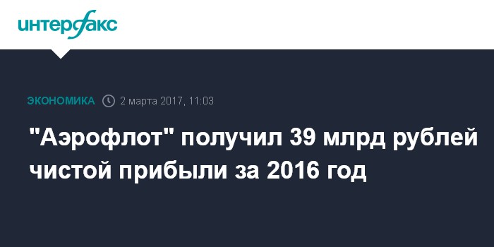 Москва. 2 марта. INTERFAX.RU - "Аэрофлот" получил 38,826 млрд рублей чистой прибыли по МСФО в 2016 году против убытка в 6,5 млрд рублей годом ранее, сообщила компания в четверг. Консенсус-прогноз "Интерфакса" предполагал чистую прибыль в размере 36,3 млрд рублей.