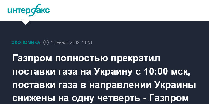 Москва. 1 января. INTERFAX.RU - Газпром полностью прекратил поставки газа на Украину с 10:00 мск, сообщили журналистам в четверг в управлении информации ОАО "Газпром".