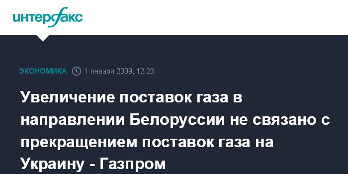 Москва. 1 января. INTERFAX.RU - Увеличение поставок газа в направлении Белоруссии не связано с прекращением поставок топлива на Украину, а связано с ростом объемов заявок потребителей как Белоруссии, так и за ее пределами, сообщили журналистам в четверг в управлении информации "Газпрома".
