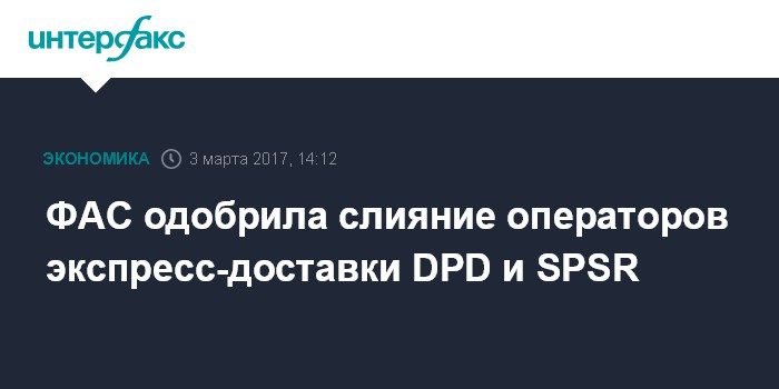 Москва. 3 марта. INTERFAX.RU - Федеральная антимонопольная служба одобрила ходатайство GeoPost (французский оператор экспресс-доставки, акционер оператора DPD) о приобретении компании "СПСР-Экспресс" (SPSR Express), говорится в сообщении ведомства. SPSR Express и DPD планируют слияние в I квартале 2017 года. Стороны направили ходатайство об одобрении сделки в ФАС в январе.