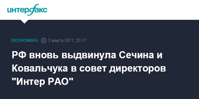 Москва. 3 марта. INTERFAX.RU - Глава "Роснефти" Игорь Сечин и предправления "Интер РАО" Борис Ковальчук выдвинуты в совет директоров подконтрольной государству энергокомпании.