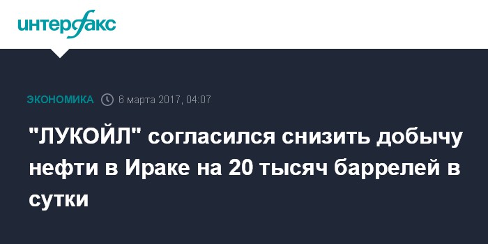 Москва. 6 марта. INTERFAX.RU - "ЛУКОЙЛ" на 20 тыс. баррелей в сутки готов снизить нефтедобычу в Ираке, который участвует в соглашении о снижении нефтедобычи с квотой в 210 тыс. баррелей в сутки, сообщил журналистам министр нефти Ирака Джабар Али аль-Ляиби в кулуарах энергетической конференции Ceraweek в Хьюстоне.