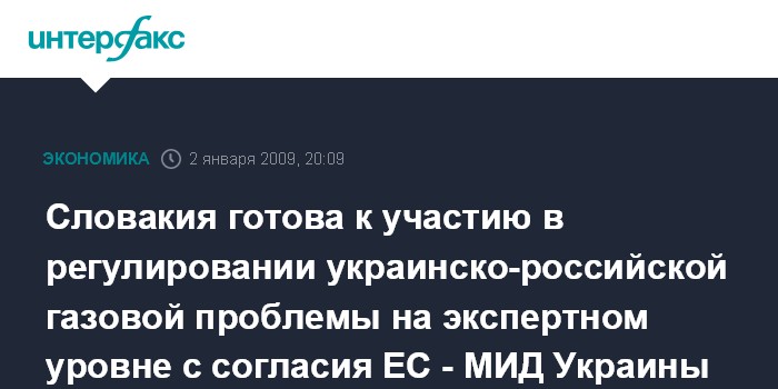 Киев. 2 января. ИНТЕРФАКС-УКРАИНА - Словакия готова как член Европейского Союза подключиться к урегулированию украинско-российской газовой проблемы на экспертном уровне после получения соответствующего мандата от ЕС, сообщает МИД Украины.