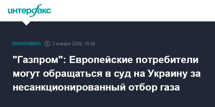 Москва. 3 января. INTERFAX.RU - Европейские потребители, пострадавшие от несанкционированного отбора на территории Украины российского газа, поставляемого на экспорт в страны дальнего зарубежья, могут обращаться в суд за нарушение Киевом транзитных обязательств.