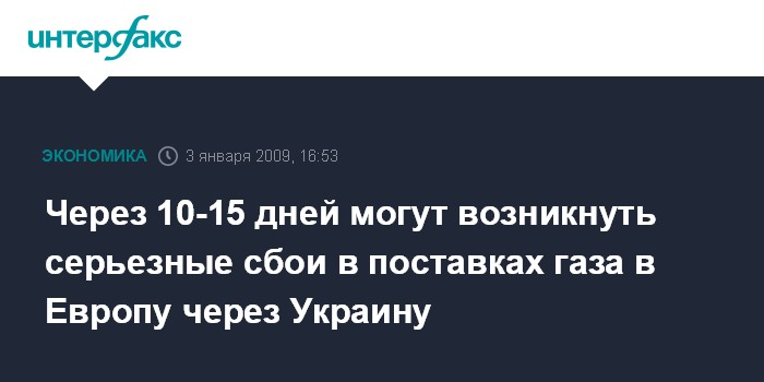 Москва. 3 января. INTERFAX.RU - При сохранении сегодняшних объемов поставок газа на Украину через 10-15 дней могут возникнуть технологические проблемы функционирования газотранспортной системы (ГТС) Украины и сбои в поставках газа в Европу, заявляет уполномоченный президента Украины по энергетическим вопросам Богдан Соколовский.