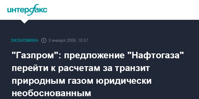 Москва. 3 января. INTERFAX.RU - В "Газпроме" называют странным и необоснованным юридически предложение "Нафтогаза Украины" вернуться к расчетам за транзит природным газом.