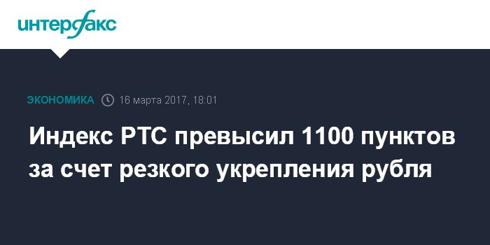 Москва. 16 марта. INTERFAX.RU - Индекс РТС, один из основных российских фондовых индикаторов, вечером в четверг превысил рубеж 1100 пунктов (уровень 7 марта) за счет резкого укрепления рубля.