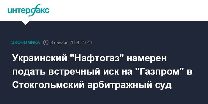 Киев. 3 января. ИНТЕРФАКС-УКРАИНА - НАК "Нафтогаз Украины" намеревается подать встречный иск в Стокгольмский арбитраж в случае обращения к нему ОАО "Газпром" с иском против НАК "Нафтогаз Украины", говорится в официальном сообщении компании.