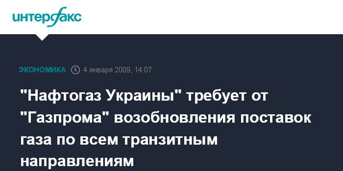 Москва. 4 января. INTERFAX.RU - Национальная акционерная компания "Нафтогаз Украины" "требует от ОАО "Газпром" (Россия) немедленного возобновления поставок газа по всем основным транзитным направлениям поставок российского газа европейским потребителям: Союз, Прогресс, Уренгой-Помары-Ужгород, Елец-Кременчуг-Тирасполь-Измаил".