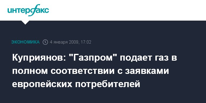 Куприянов: "Газпром" подает газ в полном соответствии с заявками европейских потребителей