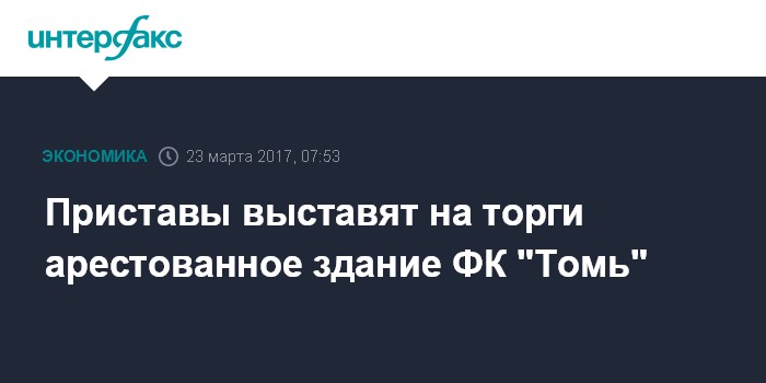 Москва. 23 марта. INTERFAX.RU - Административно-бытовой корпус футбольного клуба "Томь", который был арестован судебными приставами за долги, как ожидается, будет выставлен на продажу 24 марта, сообщила журналистам в четверг и.о. руководителя управления ФССП по Томской области Алена Романова.