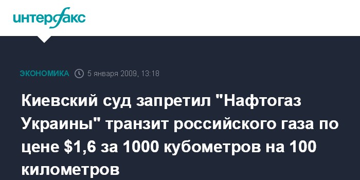 Москва. 5 января. INTERFAX.RU - Хозяйственный суд Киева своим определением запретил Национальной акционерной компании "Нафтогаз Украины" осуществлять в 2009 году транзит российского природного газа по территории Украины по цене $1,6 за 1000 куб. м на 100 км, сообщило Министерство топлива и энергетики.