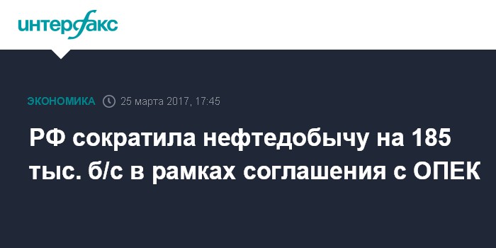 Москва. 25 марта. INTERFAX.RU - Россия достигла снижения нефтедобычи на 185 тыс. б/с в рамках договоренностей со странами ОПЕК и рядом стран не-ОПЕК, сообщил журналистам министр энергетики РФ Александр Новак.