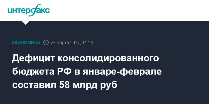 Москва. 27 марта. INTERFAX.RU - Консолидированный бюджет РФ в январе-феврале 2017 года исполнен с дефицитом 58 млрд рублей, говорится в отчетности на сайте министерства финансов РФ.