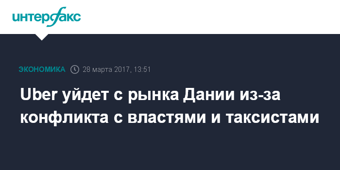 Москва. 28 марта. INTERFAX.RU - Сервис вызова такси Uber принял решение о прекращении деятельности в Дании, сообщает датское деловое издание Boerse. На брифинге 28 марта Uber объявила, что 18 апреля будет последним днем работы приложения на датском рынке, после чего доступ к ее приложению будет закрыт по всей стране.