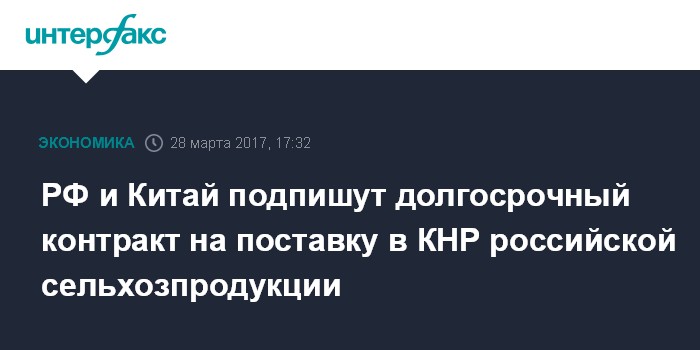 Москва. 28 марта. INTERFAX.RU - Россия и Китай подпишут долгосрочный контракт на поставку в КНР российской сельхозпродукции, сообщает Минсельхоз.