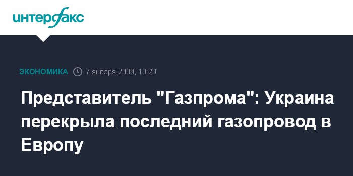 Москва. 7 января. INTERFAX.RU - Украина перекрыла последний, четвертый газопровод, по которому транзитный газ поступал в Европу, сообщил журналистам заместитель главы "Газпрома" Александр Медведев.
