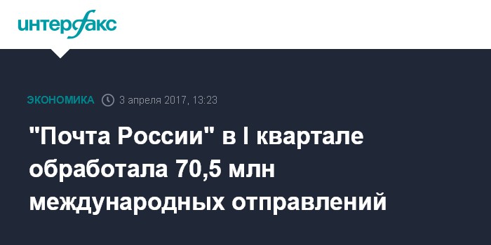 Москва. 3 апреля. INTERFAX.RU - "Почта России" в I квартале 2017 года обработала более 70,5 млн международных почтовых отправлений с товарными вложениями (посылки, мелкие пакеты, отправления EMS), что на 50,7% превышает показатель аналогичного периода прошлого года, говорится в сообщении компании.