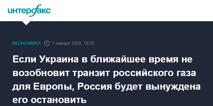 Если Украина в ближайшее время не возобновит транзит российского газа для Европы, Россия будет вынуждена его остановить