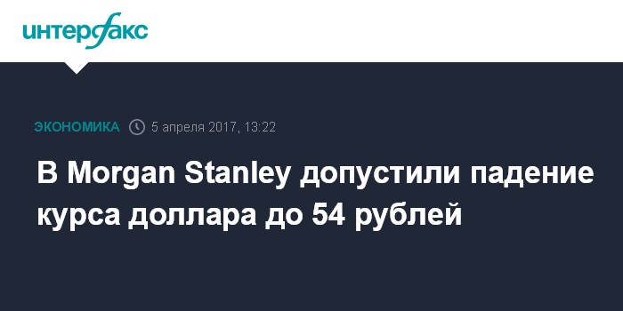 Москва. 5 апреля. INTERFAX.RU - Курс рубля вполне может протестировать уровень в 54 рубля в течение второго квартала 2017 года, считают аналитики Morgan Stanley. В то же время, как отмечается в обзоре инвестбанка, их прогноз курса рубля на конец 2017 года по-прежнему составляет 62 рубля, так как они ожидают, что оптимизм инвесторов относительно EM (развивающиеся рынки) может пойти на спад. Эксперты Morgan Stanley также полагают, что цены на нефть вырастут с текущих уровней. По их оценкам, в конце года нефть марки Brent будет стоить $62,5 за баррель.