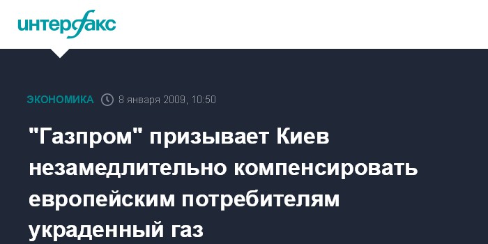Москва. 8 января. INTERFAX.RU - ОАО "Газпром" официально заявляет, что подача газа европейским потребителям прекращена по вине Киева, и призывает украинскую сторону срочно компенсировать покупателям недополученные объемы газа.