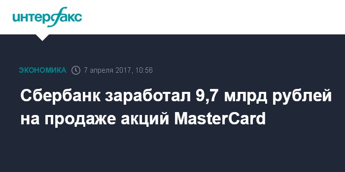 Москва. 7 апреля. INTERFAX.RU - Сбербанк в марте 2017 года продал акции MasterCard, за счет чего получил за месяц 9,7 млрд рублей дохода от операций с ценными бумагами, говорится в сообщении банка. Эта сделка положительно сказалась на динамике операционного дохода, отмечает банк. Операционный доход до вычета резервов в первом квартале 2017 года увеличился на 16,9% - до 372,5 млрд рублей.