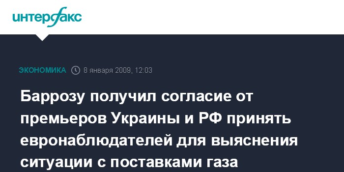 Вместе с тем он считает, что критически важно возобновить поставки газа немедленно. "Для европейского потребителя все равно, где создана проблема - в России или в Украине. Сейчас газ из России не поставляется в наши страны", - подчеркнул Ж.Баррозу.