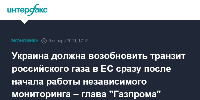 Брюссель. 8 января. INTERFAX.RU - Председатель "Газпрома" Алексей Миллер заявляет, что Украина должна будет возобновить транзит российского газа в ЕС сразу после того, как к выполнению своих функций приступит независимый мониторинг.