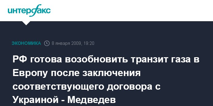 Сочи. 8 января. INTERFAX.RU - Россия готова возобновить поставки газа европейским потребителям через территорию Украины после заключения соответствующих договоренностей с Украиной, заявил президент России Дмитрий Медведев в телефонном разговоре с болгарским коллегой Георгием Пырвановым.