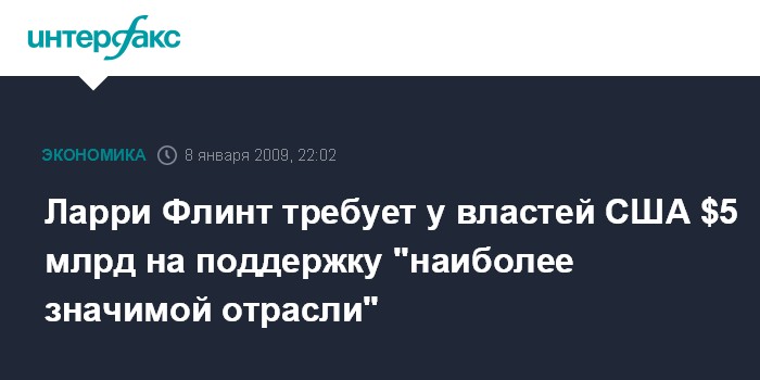 Лондон. 8 января. ИНТЕРФАКС - Боссы американской порноиндустрии, включая основателя журнала Hustler Ларри Флинта, попросили у Вашингтона 5 млрд долларов помощи в связи с глобальным экономическим кризисом, сообщает в четверг британская телерадиокорпорация Би-би-си.