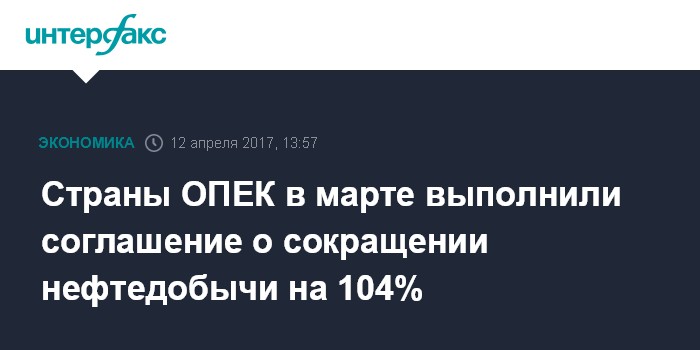 Москва. 12 апреля. INTERFAX.RU - Страны ОПЕК, входящие в соглашение о сокращении нефтедобычи, в марте выполнили его на 104%, следует из расчетов "Интерфакса" на базе нового ежемесячного отчета картеля.