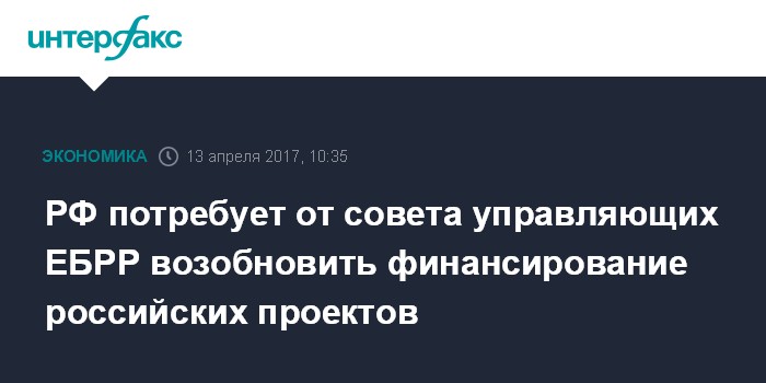 Москва. 13 апреля. INTERFAX.RU - РФ на заседании совета управляющих Европейского банка реконструкции и развития (ЕБРР) 9-10 мая на Кипре собирается потребовать признать принятое ранее советом директоров "политическое руководство" менеджменту о прекращении любых новых операций в России не соответствующим соглашению об учреждении ЕБРР и призвать совет директоров отменить его.